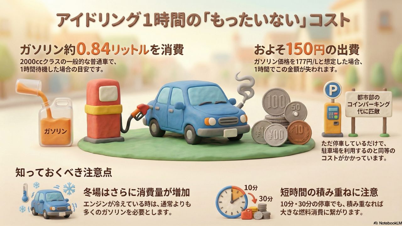 結論から言うと、一般的な普通車(2000ccクラス)でエンジンをかけたまま1時間待機した場合、約0.84リットルのガソリンが減ると考えられています。