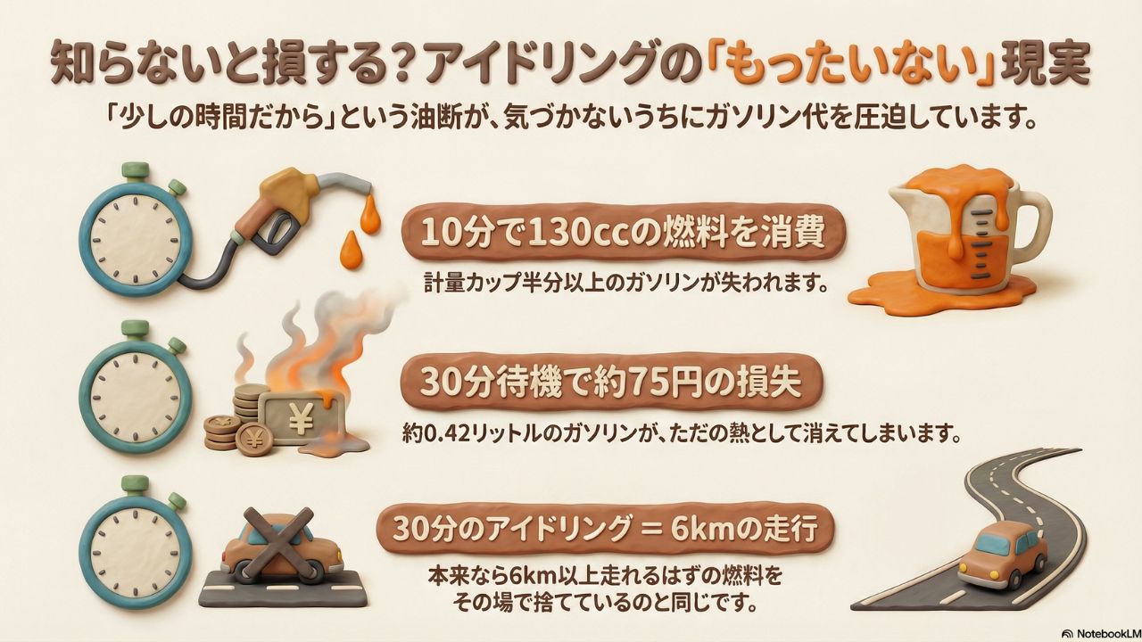 少しの時間の積み重ねが、気づかないうちにガソリン代を圧迫しているかもしれませんね。