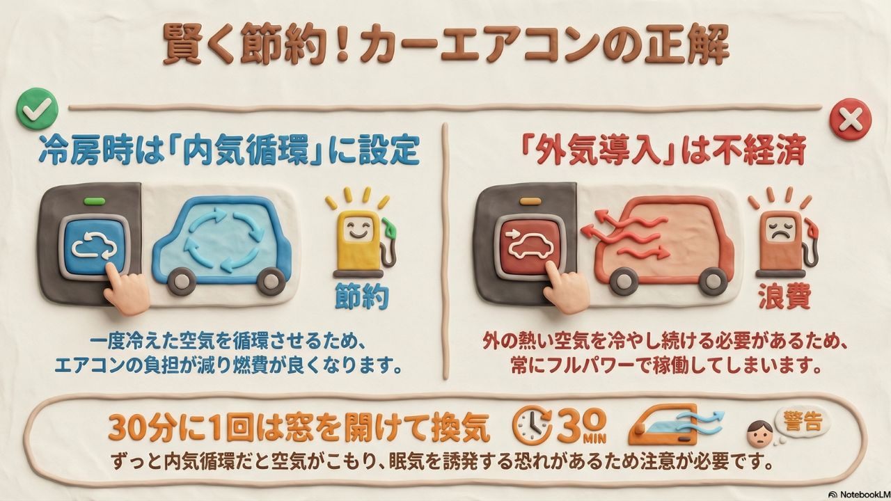- 冷房を使うときは「内気循環」を基本にすることで、エアコンの効率がグッと良くなる