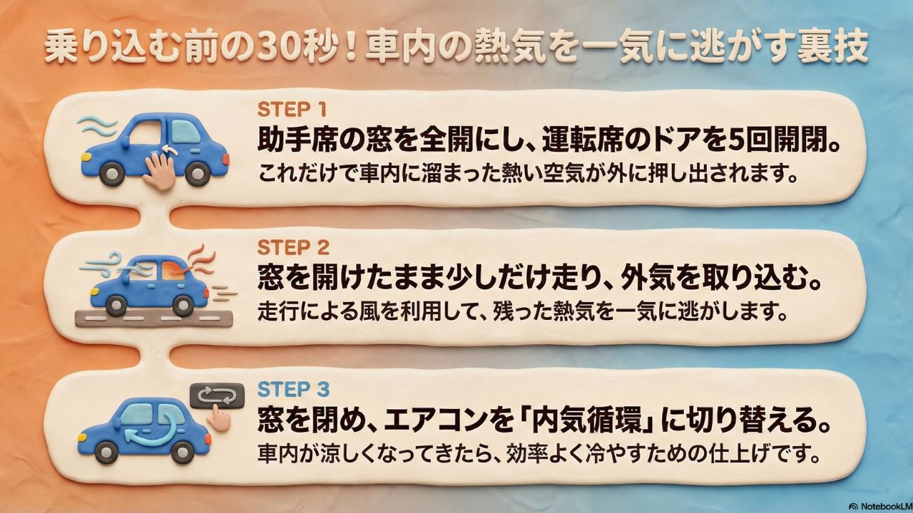 その後、窓を開けたまま少しだけ走り、涼しくなってきたら窓を閉めて内気循環に切り替えるのが一番賢いやり方です。