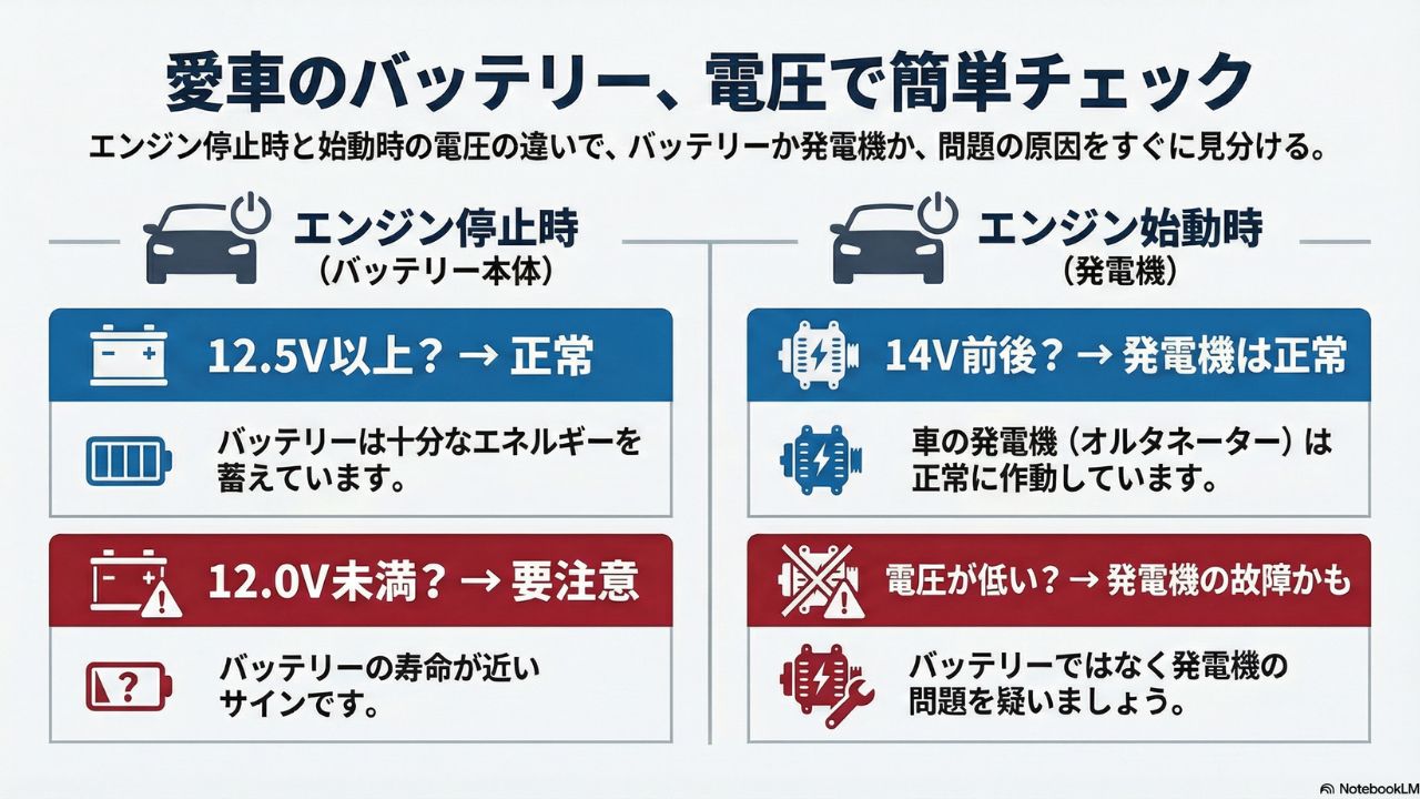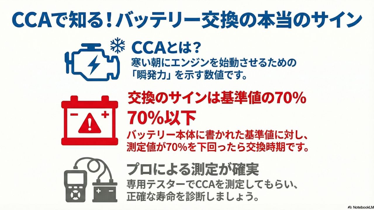 - 電圧だけでなく、エンジンをかける瞬発力(CCA)も併せて診断してもらうのが確実