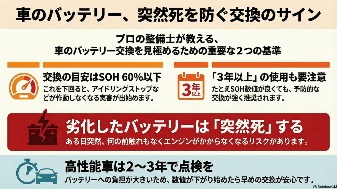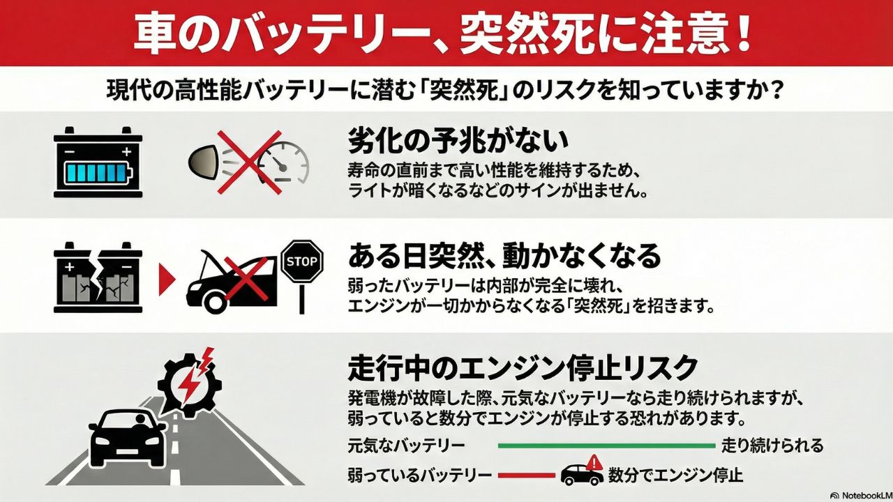 なぜなら、劣化したバッテリーはある日突然、前触れなく死んでしまう「突然死」のリスクがあるからです。