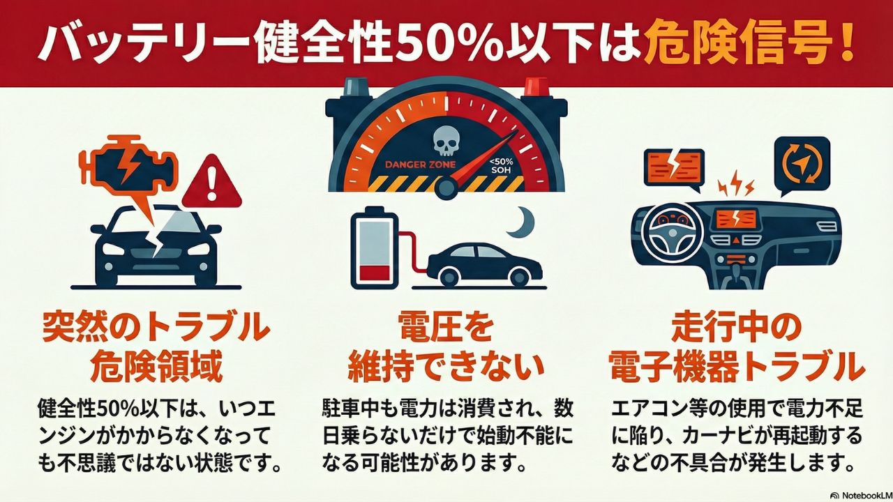 健全性(SOH)が50%を下回ってくると、バッテリーはもはや「いつトラブルが起きても不思議ではない」という危険な領域に足を踏入れたことになります。