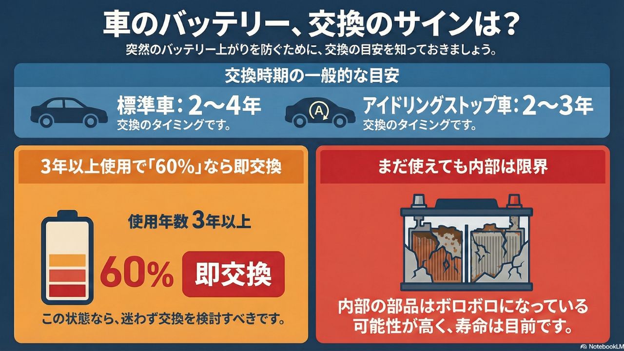 この数値を下回ると、アイドリングストップ機能が作動しなくなるなどの実害が出始めるからです。ただし、数字だけではなく「使用年数」も重要な判断基準になります。