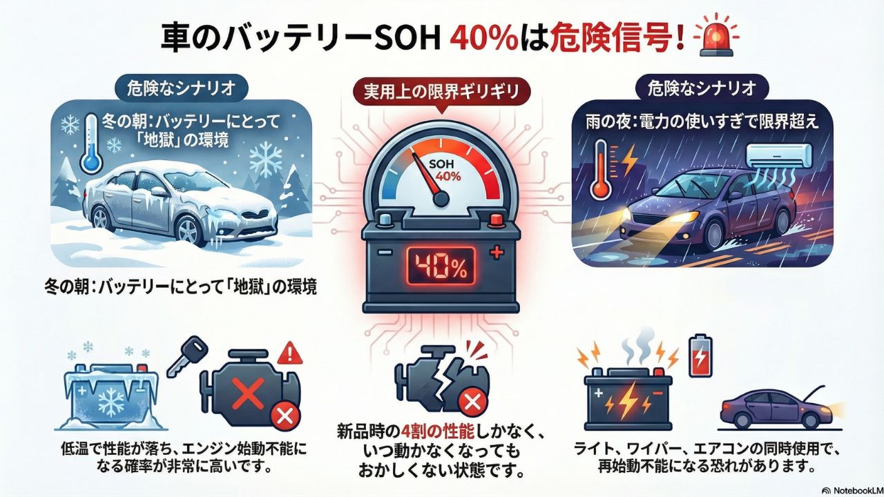- 健全性(SOH)60%は「そろそろ寿命」を疑うべき初期サイン