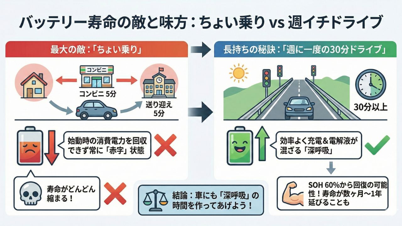 車のバッテリーにとって最大の敵は「ちょい乗り」です。