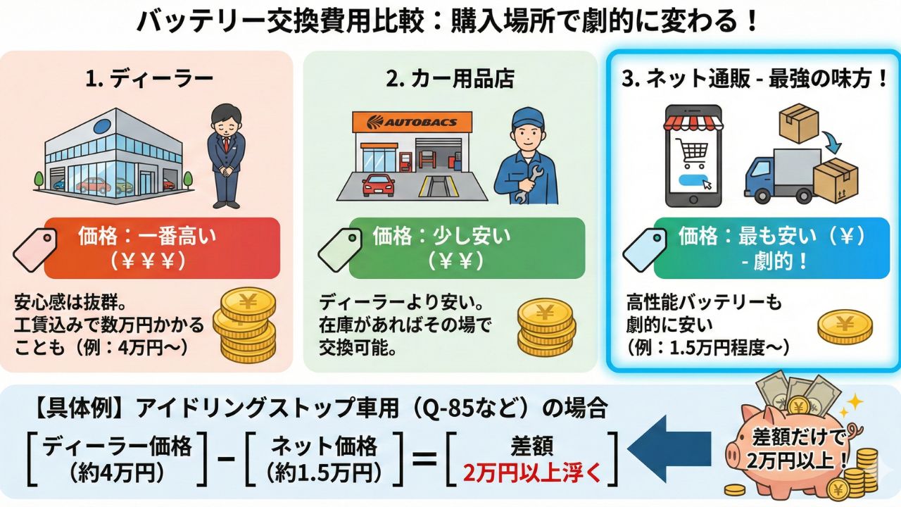 「バッテリー交換は高い」というイメージがありますが、実はどこで買うかによって値段は劇的に変わります。