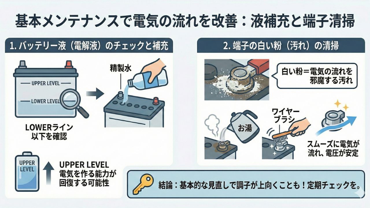 - バッテリー液の不足や端子の汚れなど、基本的なメンテナンスで改善する場合もある