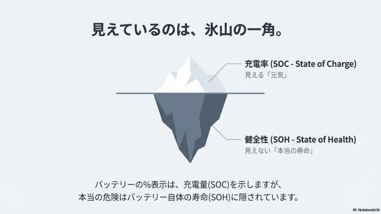 1つは「SOC(充電率)」、もう1つは「SOH(健全性)」です。SOCとは、スマホの電池残量と同じで「今どれだけ電気が溜まっているか」という数字です。