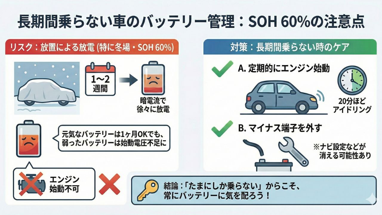 もし長期間乗らないことが分かっている場合は、定期的にエンジンをかけて20分ほどアイドリングさせるか、マイナス側の端子を外しておくといった対策を検討しましょう(※端子を外すとナビの設定などが消える場合があるので注意が必要です)。
