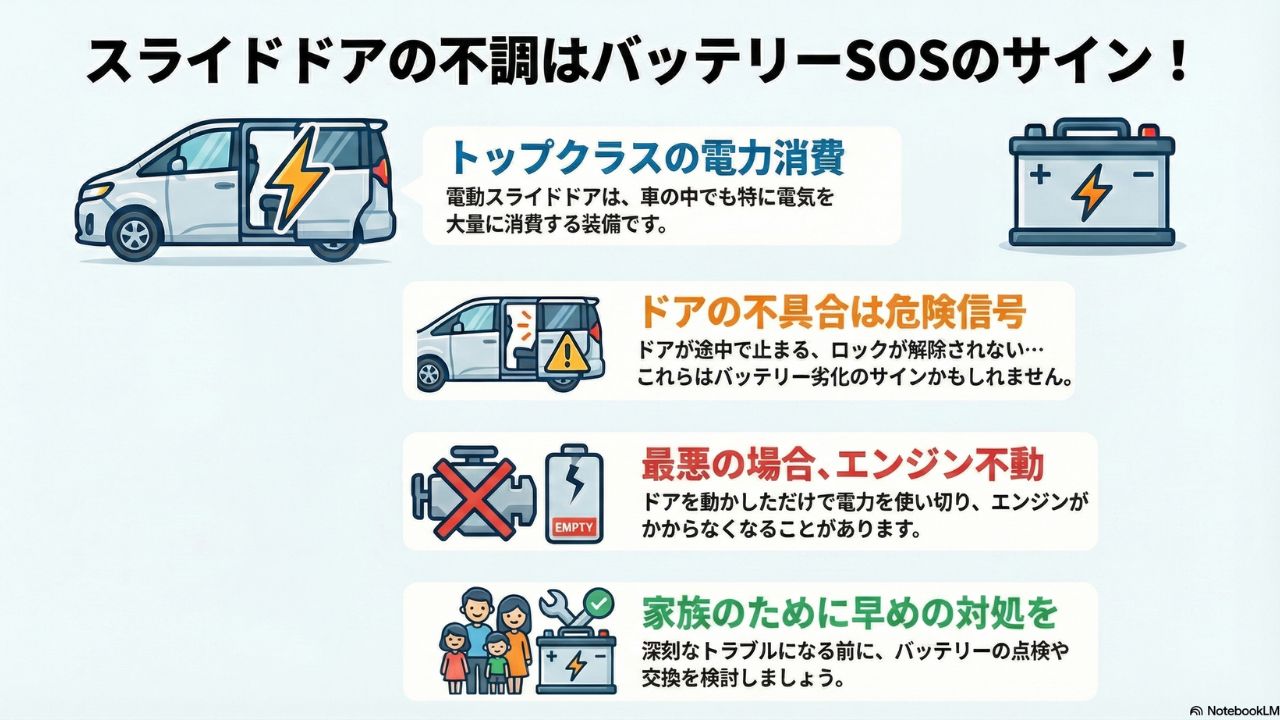 しかし、実はこのスライドドア、車の中でもトップクラスに電気を食う装備なんです。