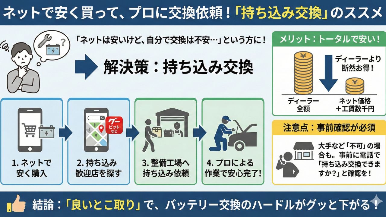 注意点としては、大手カー用品店などは「自店で購入したもの以外は交換不可」という場合もあるので、事前に電話で「ネットで買ったバッテリーの交換だけをお願いできますか?」と確認しておくのがスムーズです。