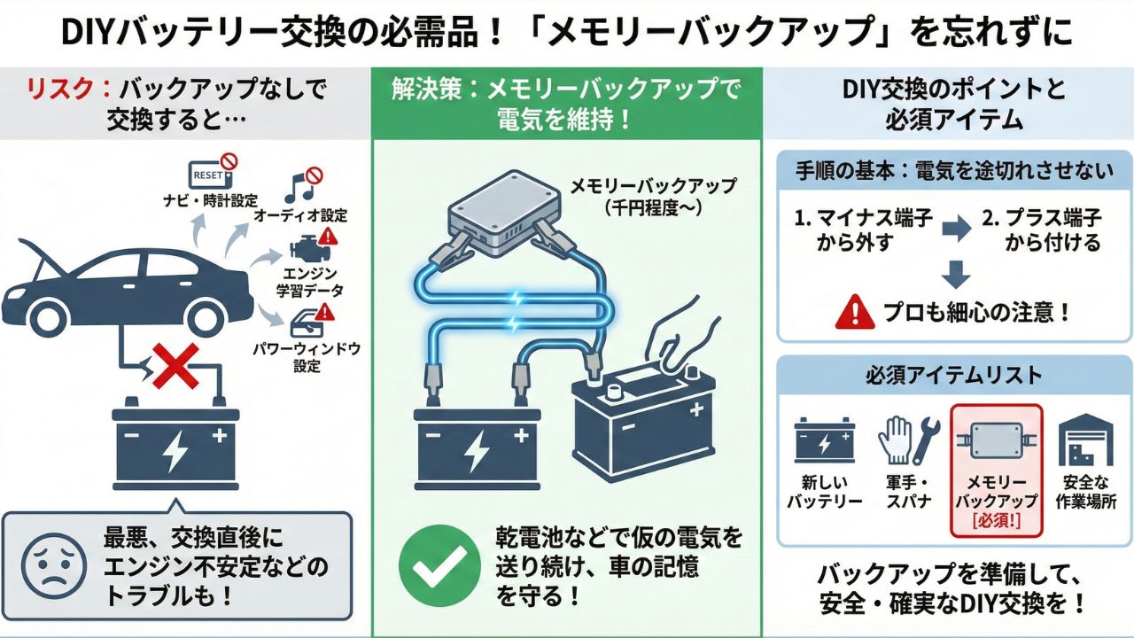 - 自分で交換する際は、設定消失を防ぐための「メモリーバックアップ」を必ず使用する