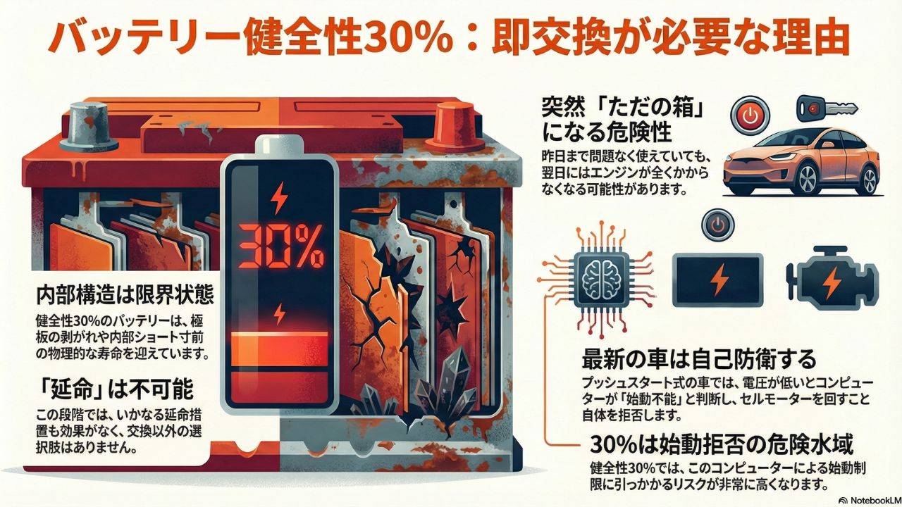 健全性が30%まで落ち込んでいる場合、バッテリーの内部構造はボロボロの状態であると考えられます。