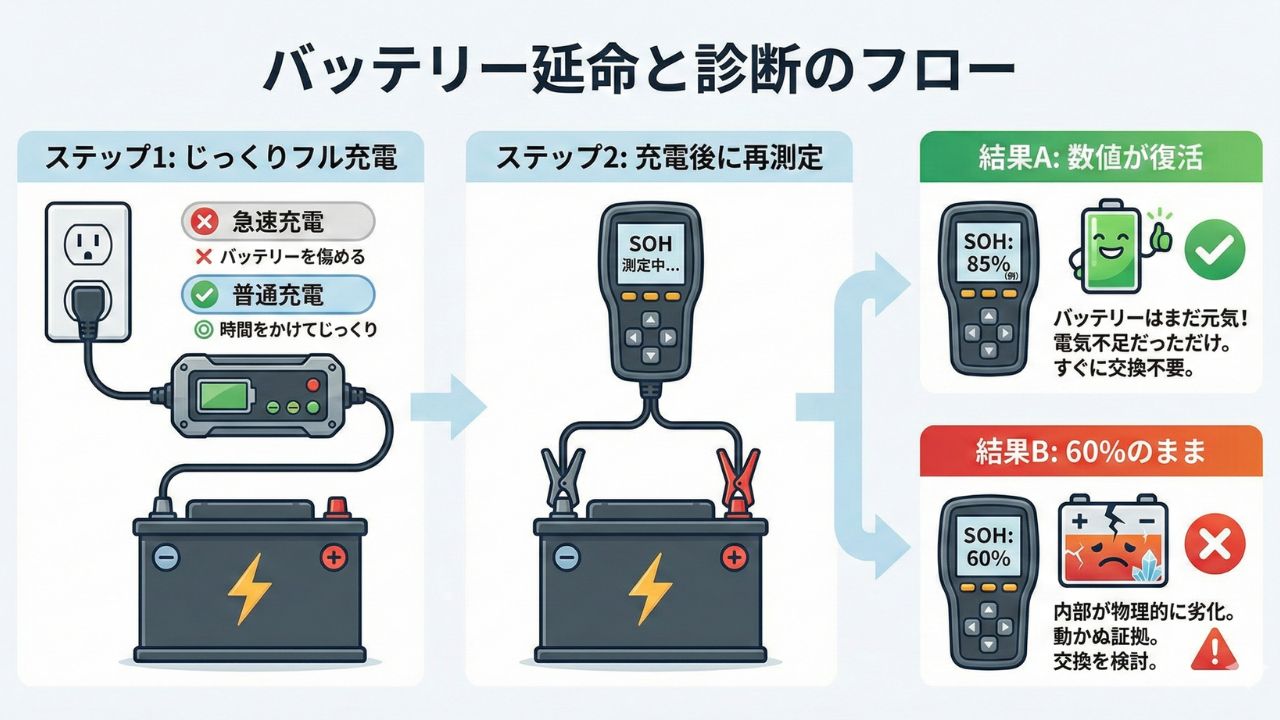- 健全性(SOH)60%なら、回復の余地が少ない「寿命のサイン」と捉える