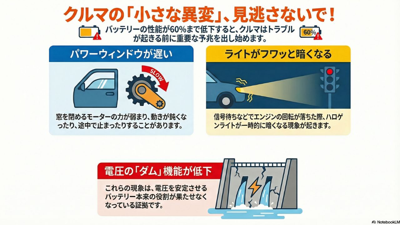 また、走行中にエアコンやライトをフル活用した際、一時的な電力不足を補いきれず、カーナビが再起動したり電子制御に不具合が出たりすることもあるため、早めの対策が必要です。