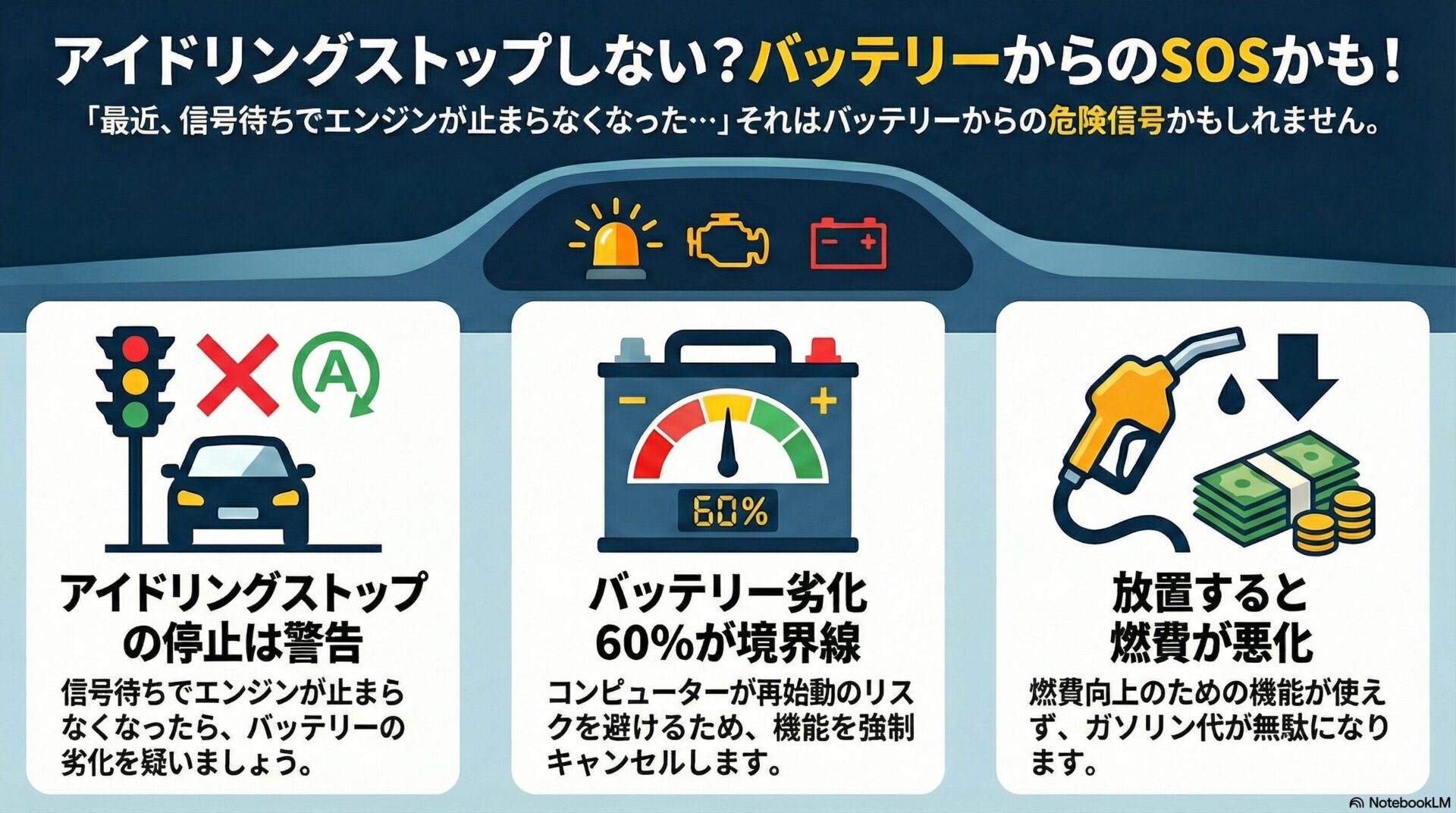 「最近、信号待ちでエンジンが止まらなくなったな」と感じたら、それはバッテリーからのSOSかもしれません。