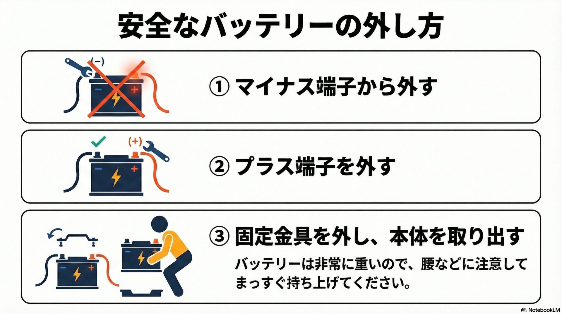 - 安全なバッテリーの外し方:マイナス端子から外す鉄則