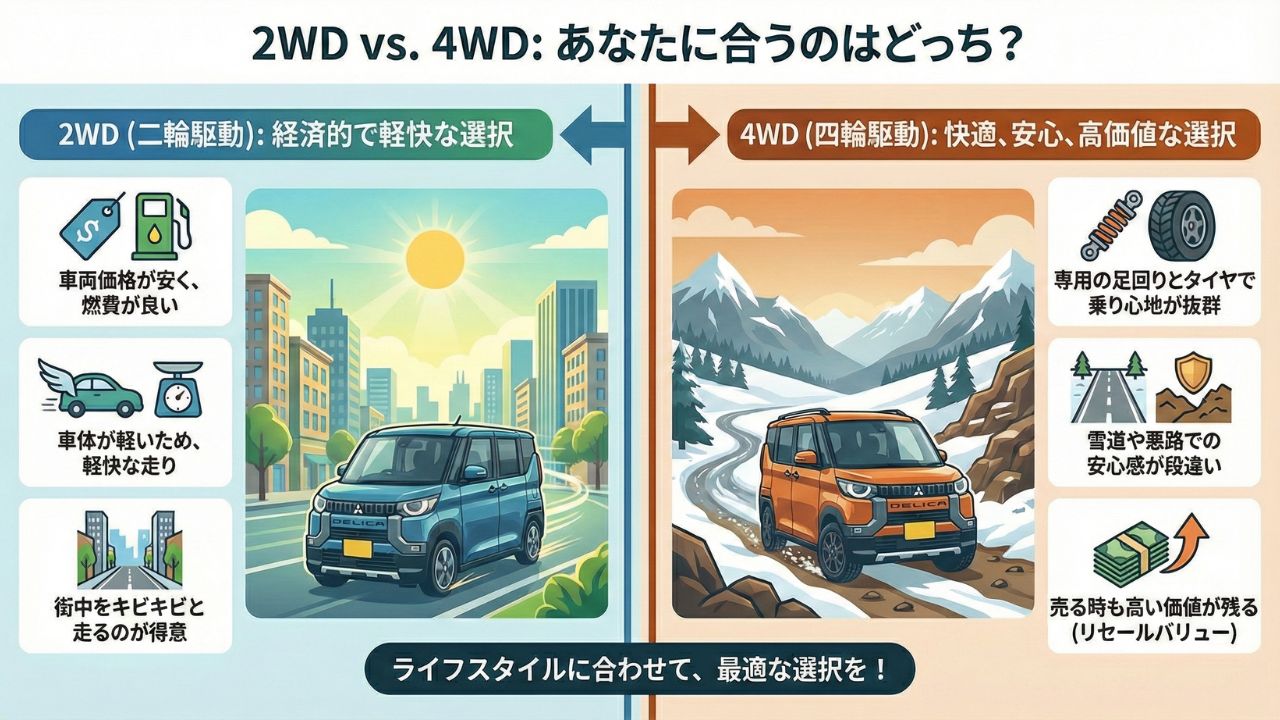 デリカミニの購入を決めた際、最後に頭を悩ませるのが「2WDと4WDのどちらにするか」という問題ですよね。