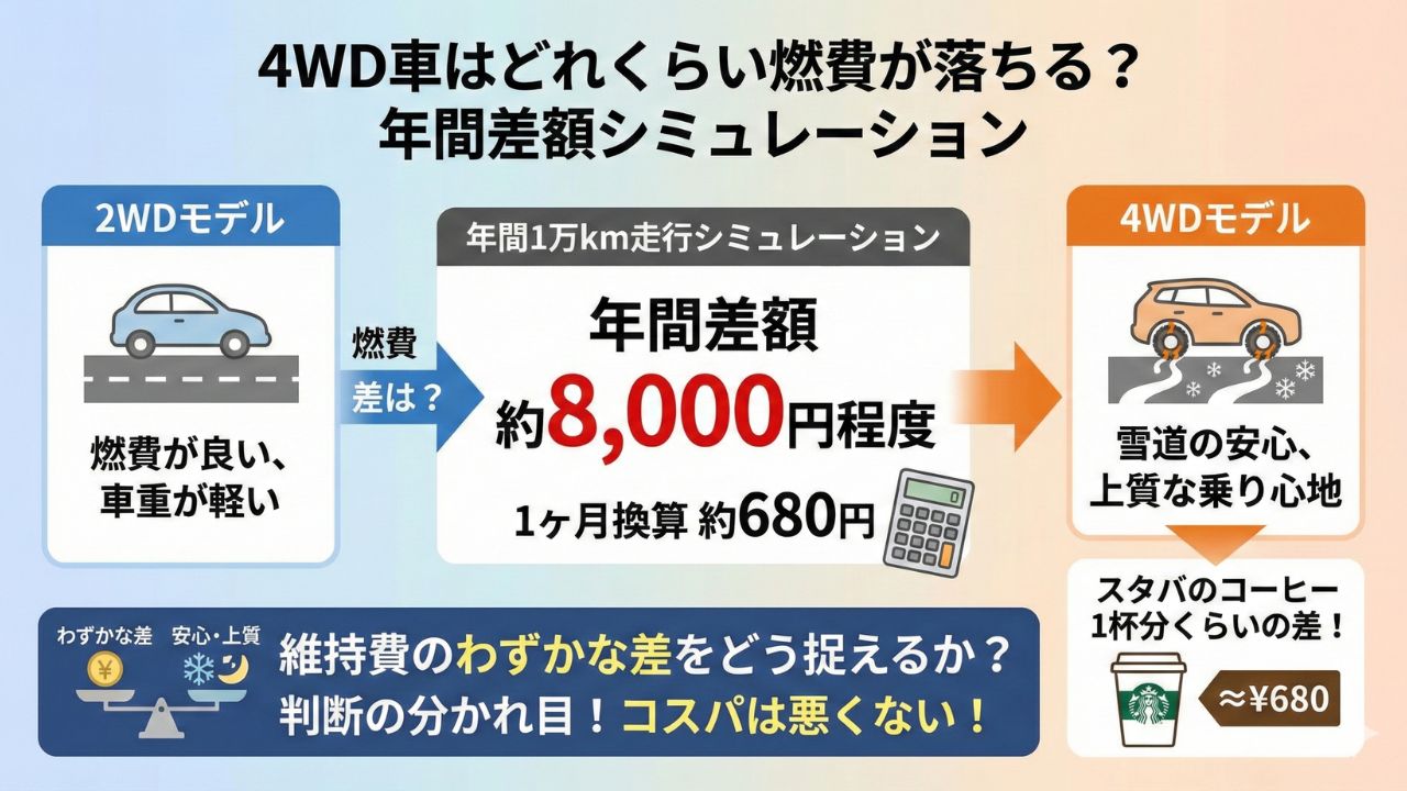 • 2WDと4WDの年間ガソリン代の差は約8,000円程度