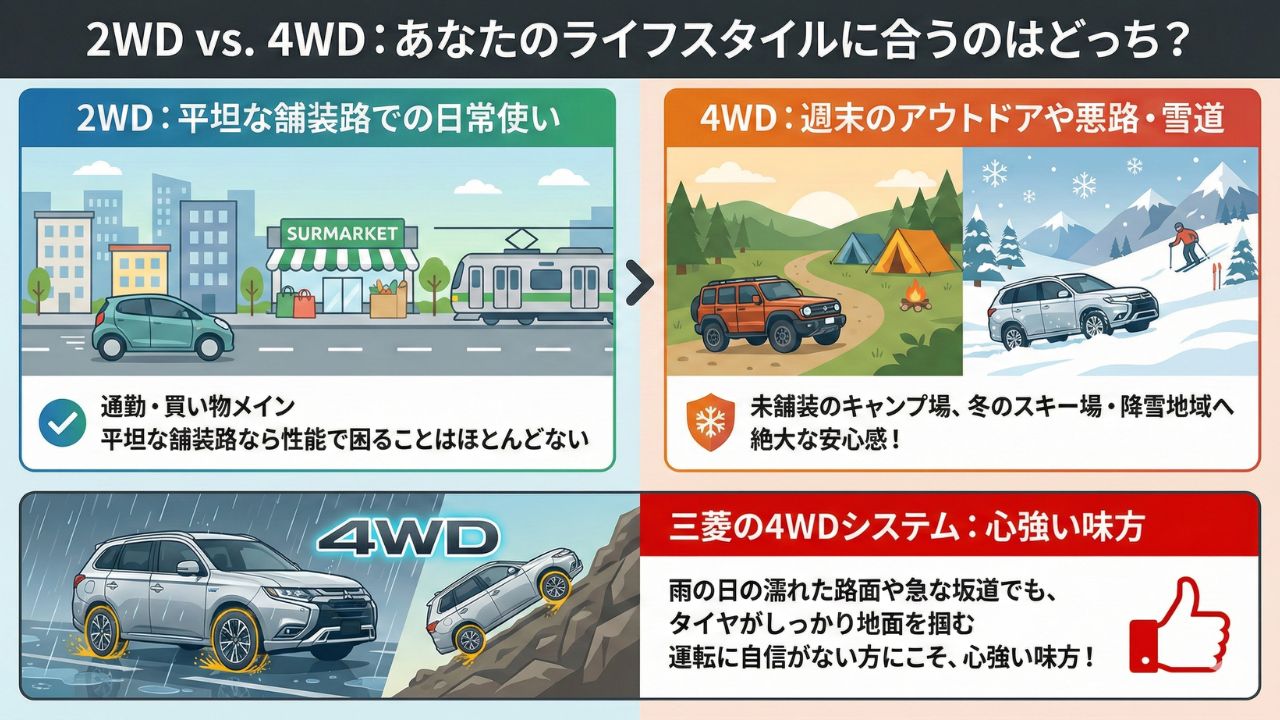 単なる移動手段としてだけでなく、家族との思い出を作る「頼れる相棒」を求めているなら、4WDを選んで間違いありません。