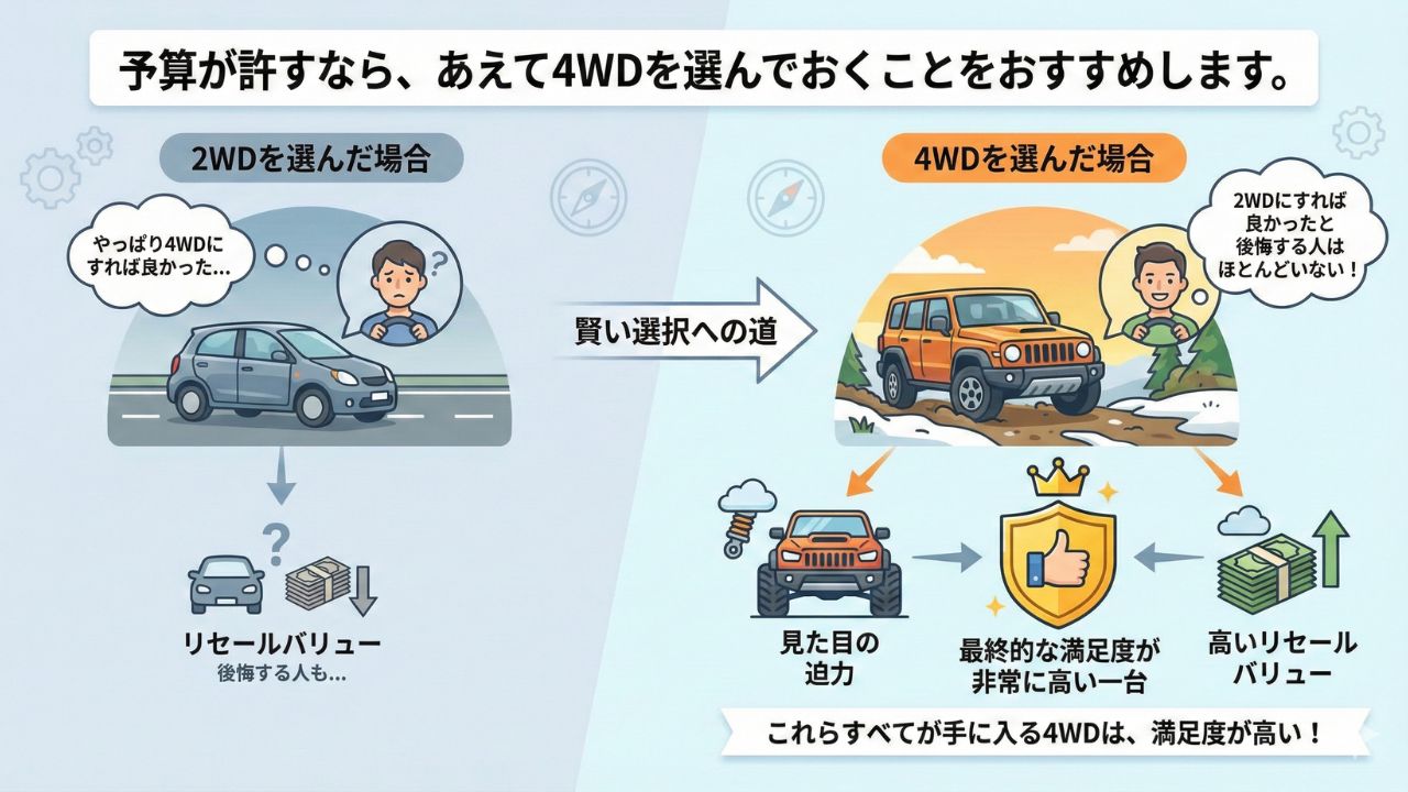 • 迷った時は、満足度とリセールの高い4WDを選ぶのが後悔しないコツ