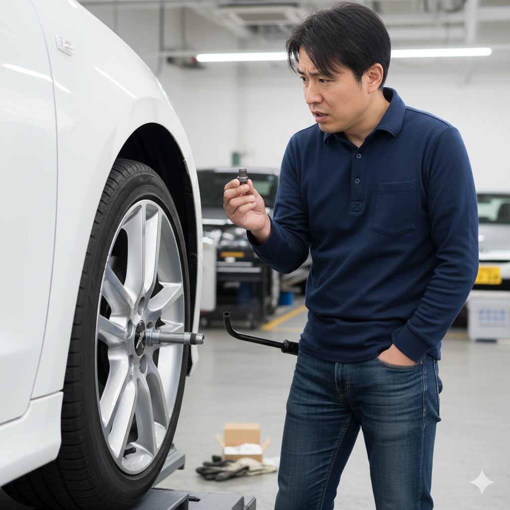 最も確実な方法は、購入前に、実際に自分の車についている既存のナットを1本取り外し、その「ネジ径」「ピッチ」「座面形状」を物理的に確認することです。