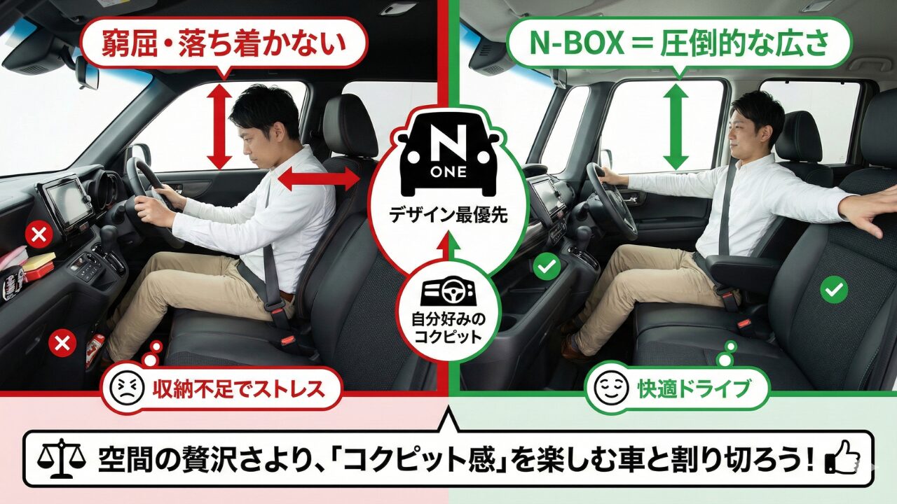 N-ONEはデザインを最優先した結果、N-BOXのような圧倒的な広さはありません。