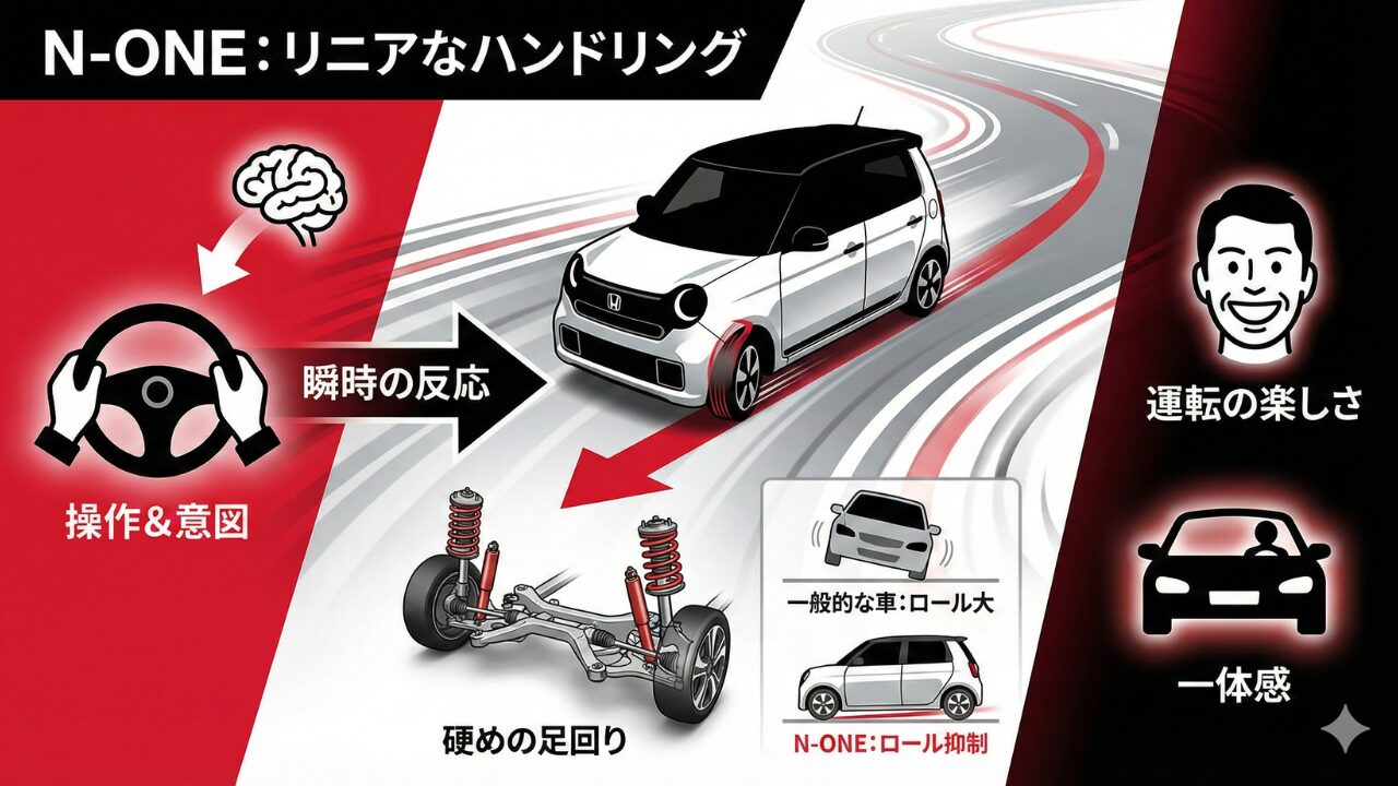 N-ONEは、軽自動車にありがちな「フワフワして頼りない動き」を抑えるために、あえて足回りをしっかり固めて設計されています。