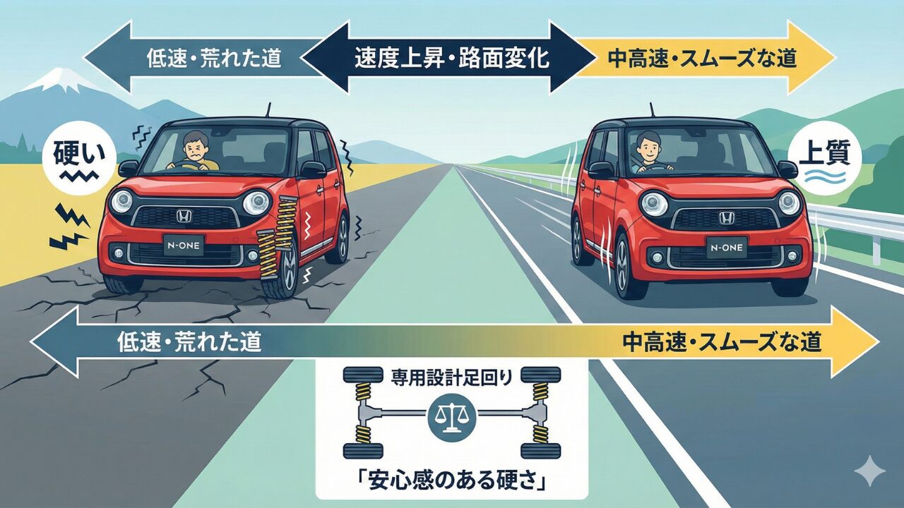 - N-ONEの乗り心地は、走行安定性を重視した「意図的な硬さ」である
