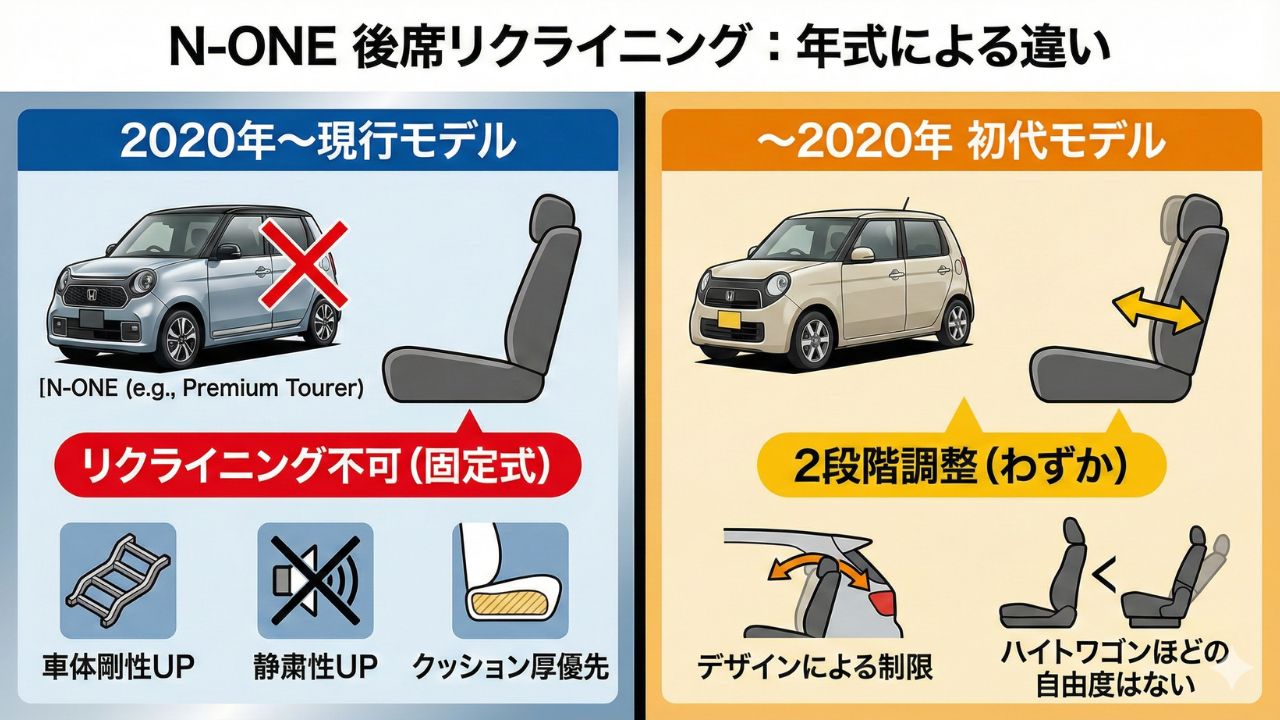 実は、N-ONEのリクライニング機能は、年式(モデル)によって大きく異なります。 まず現行モデル(2020年〜)は、実質的にリクライニングができない「固定式」です。