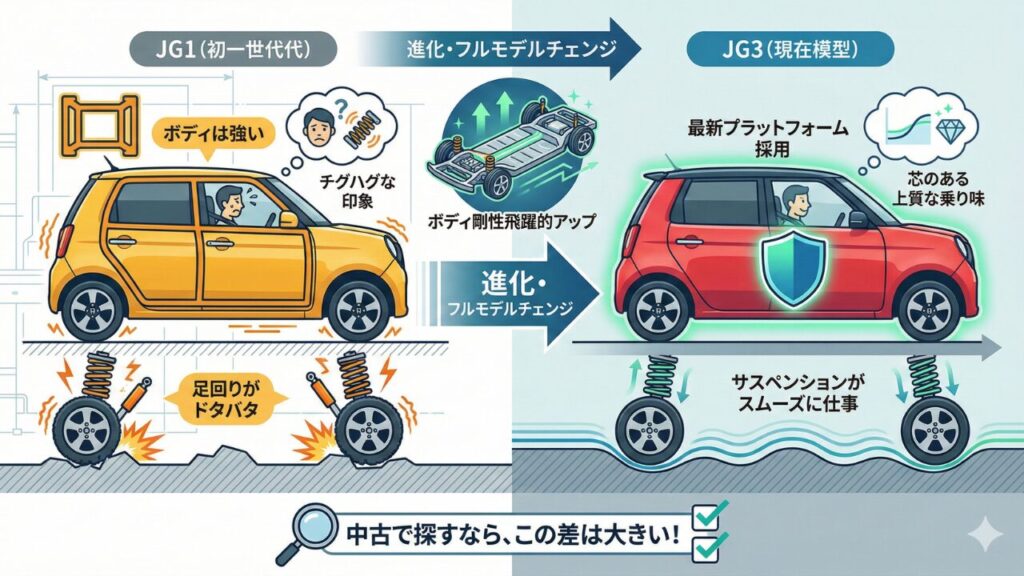 初代(JG1)から現行モデル(JG3)への進化で、乗り心地の質は大きく変わりました。