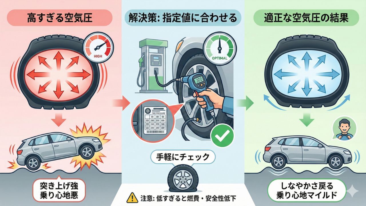 空気圧が高すぎるとタイヤがパンパンに張ってしまい、余計に突き上げが強くなってしまいます。