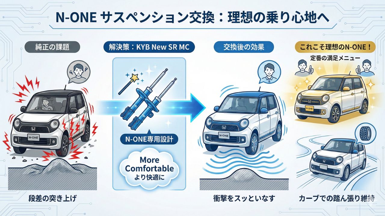 特にKYB(カヤバ)の「New SR MC」のような製品は、N-ONE専用に「より快適に(More Comfortable)」をコンセプトに開発されています。
