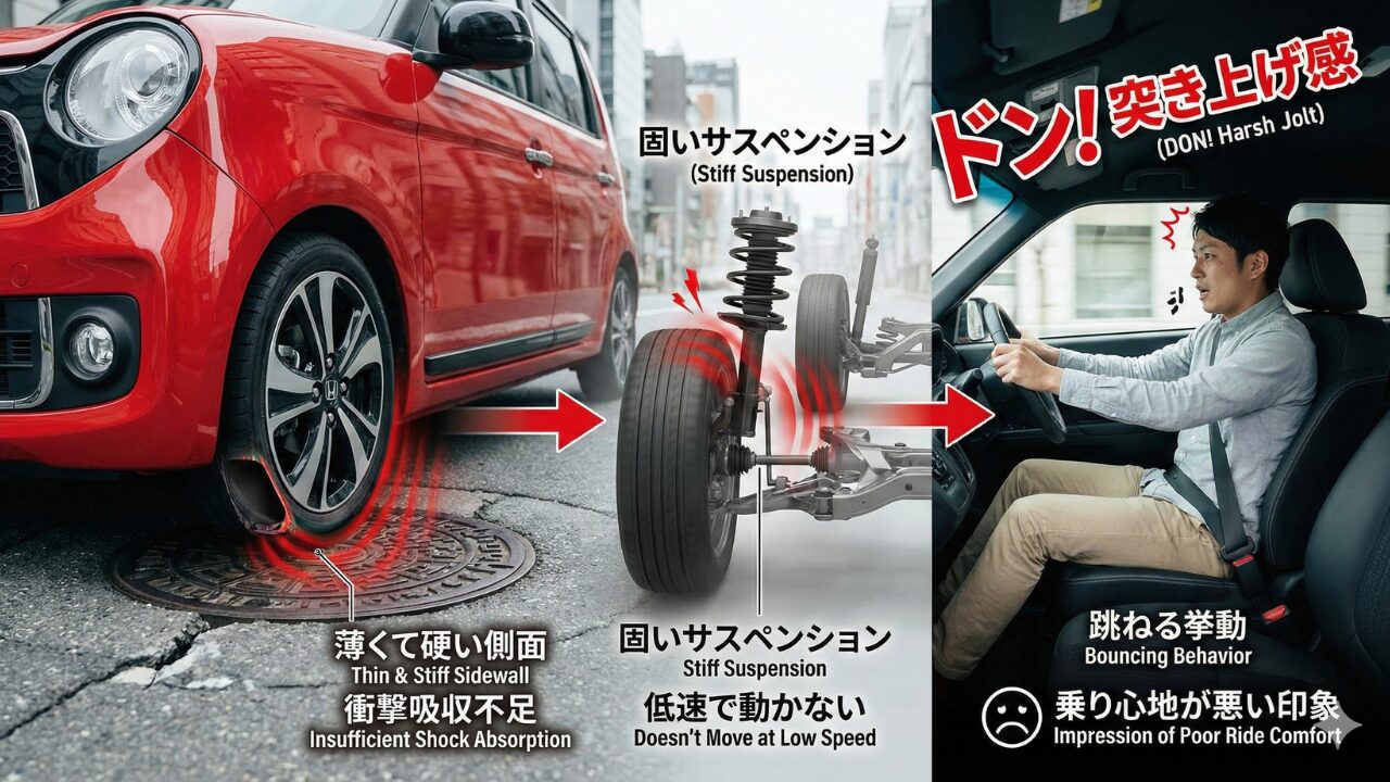 これはタイヤの側面が薄くて硬いため、路面からの衝撃をタイヤで吸収しきれず、そのまま車体に伝えてしまうことが主な原因と考えられます。