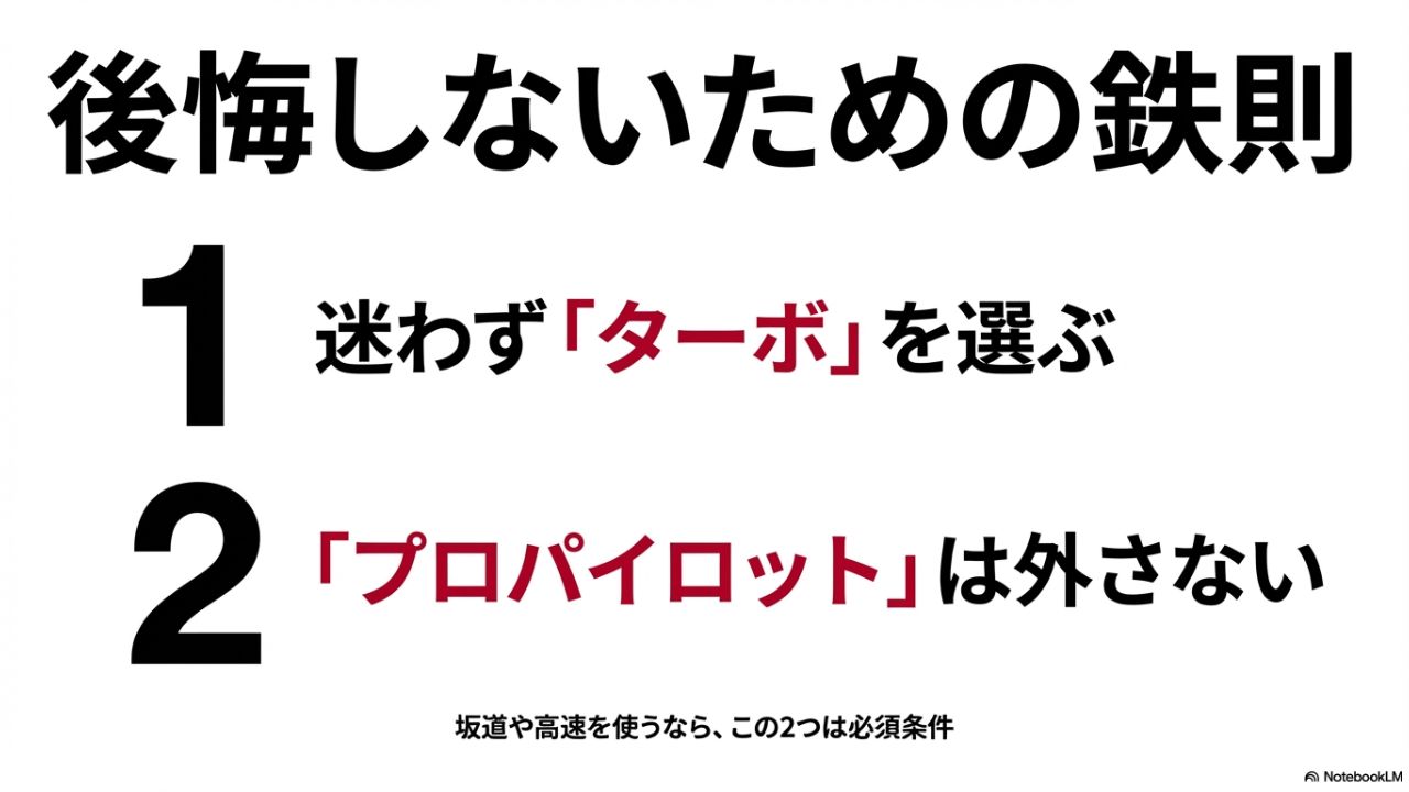 パワー不足を感じたくないなら、ターボ車の検討が推奨されます。
