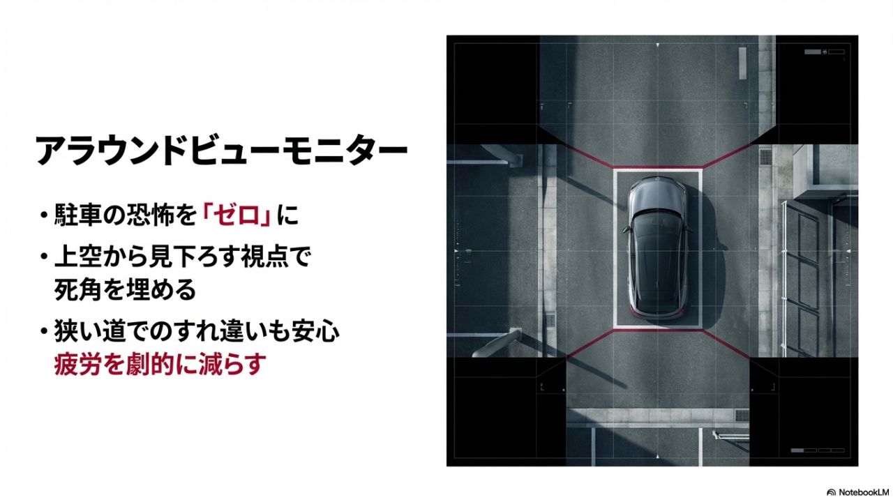 バックでの駐車が苦手な方や、狭い道ですれ違うのが怖いという方にとって、これほど頼もしい機能はありません。