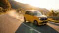 曇り空の下、急な坂道を走行する軽自動車の後ろ姿。加速性能への不安を象徴するシーン