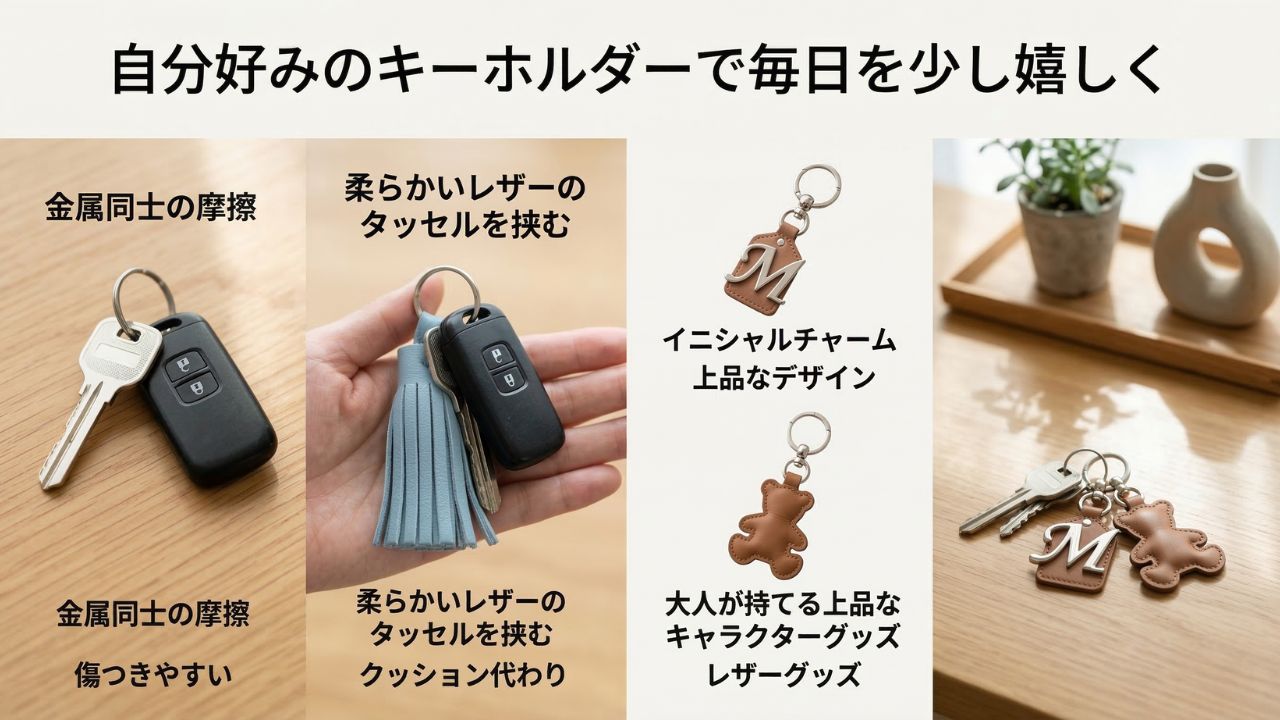 - 見せるおしゃれを楽しむなら「上質なキーホルダー」と「専用カバー」を併用する