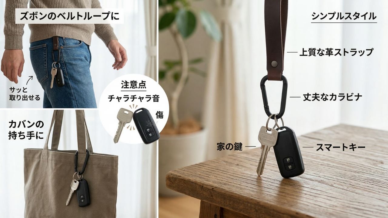 上質な革のストラップや丈夫なカラビナを使って、家の鍵とスマートキーを繋ぐだけのシンプルスタイルですね。