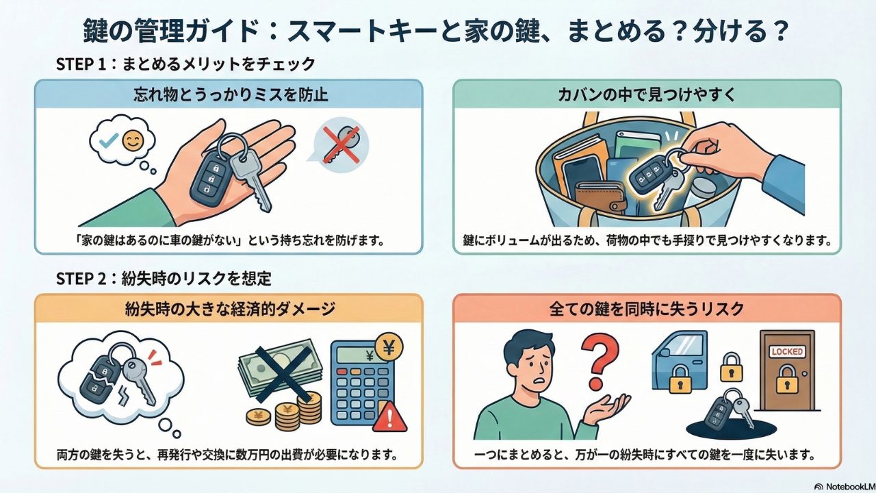 スマートキーと家の鍵を一つにまとめるか、別々に持つか、迷いますよね。