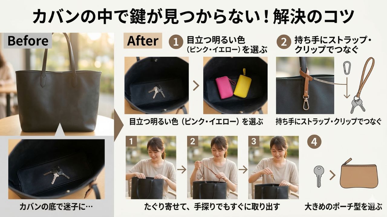 大きめのバッグを使うことが多い女性は、「カバンの底で鍵が迷子になる」という悩みを抱えがちですよね。