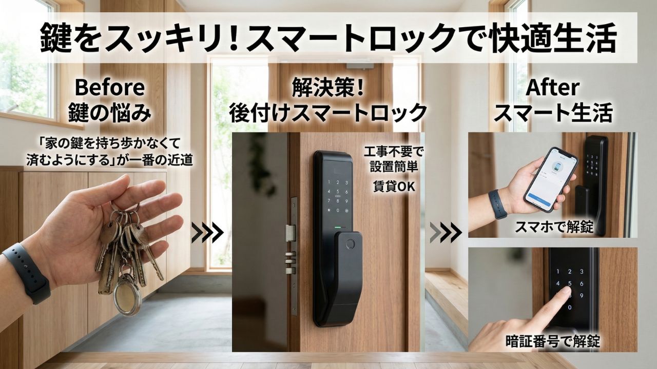 実は、鍵をスッキリさせる一番の近道は「家の鍵を持ち歩かなくて済むようにする」ことなんです。最近は、スマホや暗証番号でドアを開けられる「後付けのスマートロック」が普及しています。