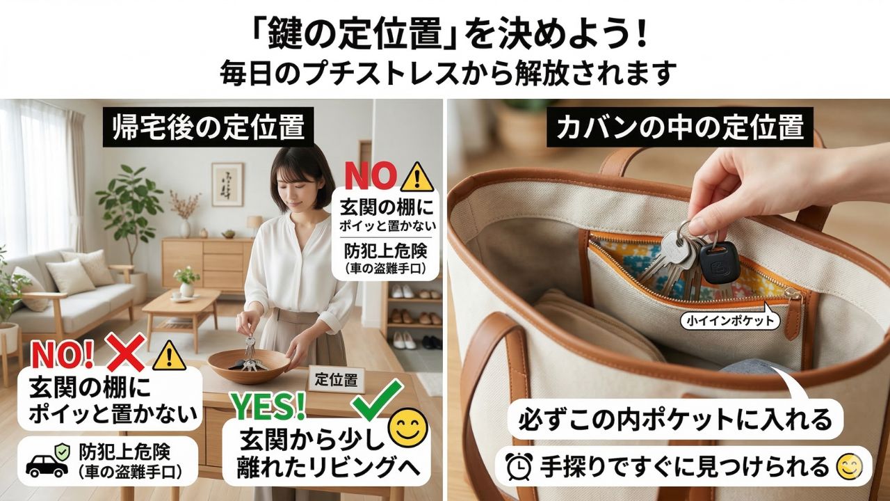 このルールを決めるだけで、毎日の「鍵どこだっけ?」というプチストレスから解放されます。