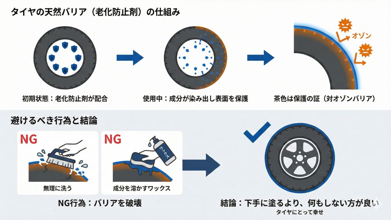 実は、タイヤの茶色い変色は「老化防止剤が仕事をしている証拠」なので、無理に落とす必要はありません。
