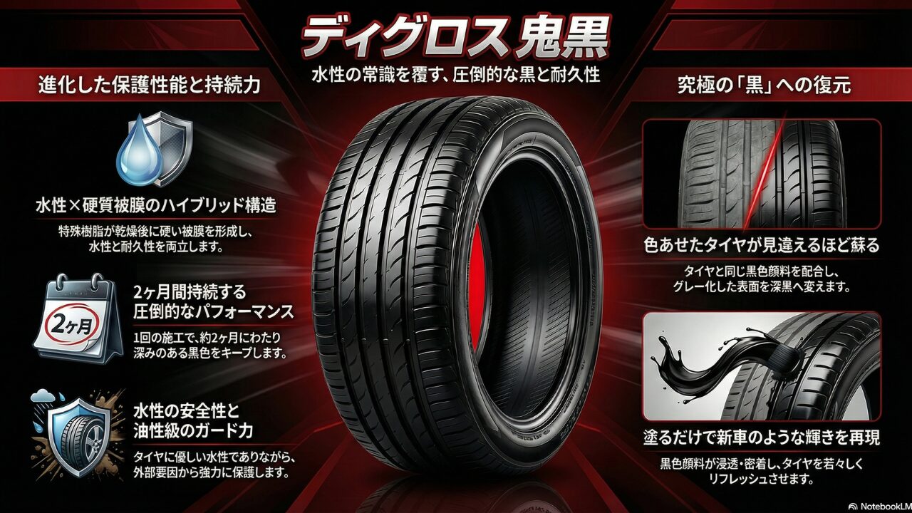 水性の弱点である「耐久性」を見事に克服したのが、ソフト99の「ディグロス 鬼黒」です。