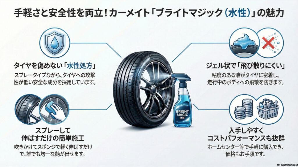 手軽さと安全性を両立させたいなら、カーメイトの「ブライトマジック(水性)」がおすすめです。