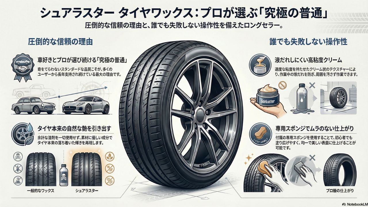 圧倒的な信頼を誇るのが「シュアラスター タイヤワックス」です。