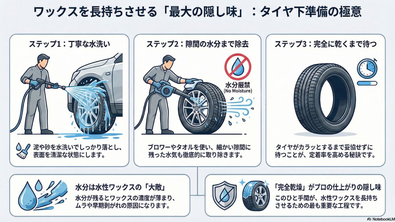 ワックスを塗る前に一番大切なのは、タイヤを「完全に乾かす」ことです。